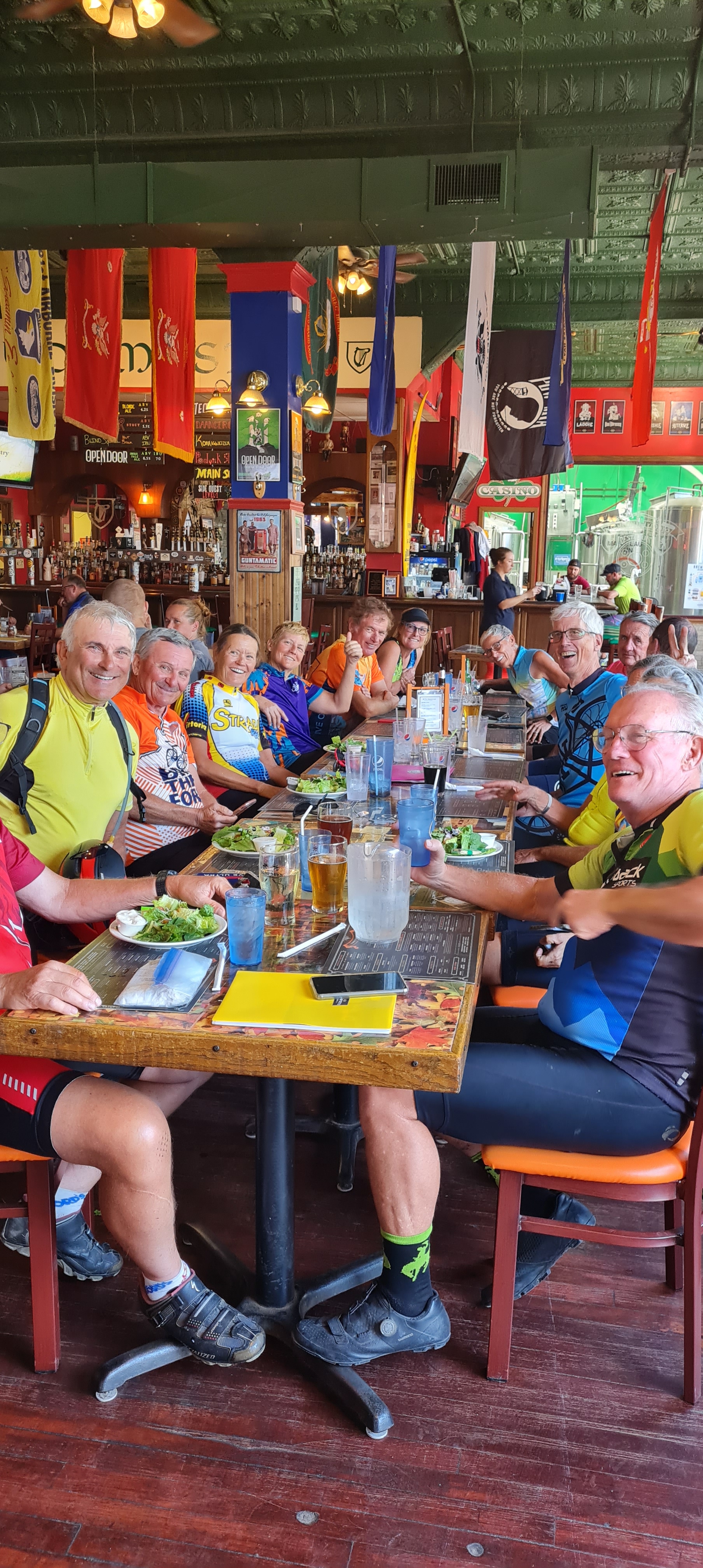 Dan, notre super routeur, nous avait indiqué un super restaurant grill 2 miles avant l’école qui nous heberge. Du coup, la quasi totalité du groupe s’y est retrouvé : trop sympa de voir tous les vélos garés dehors et ces cyclistes dedans.