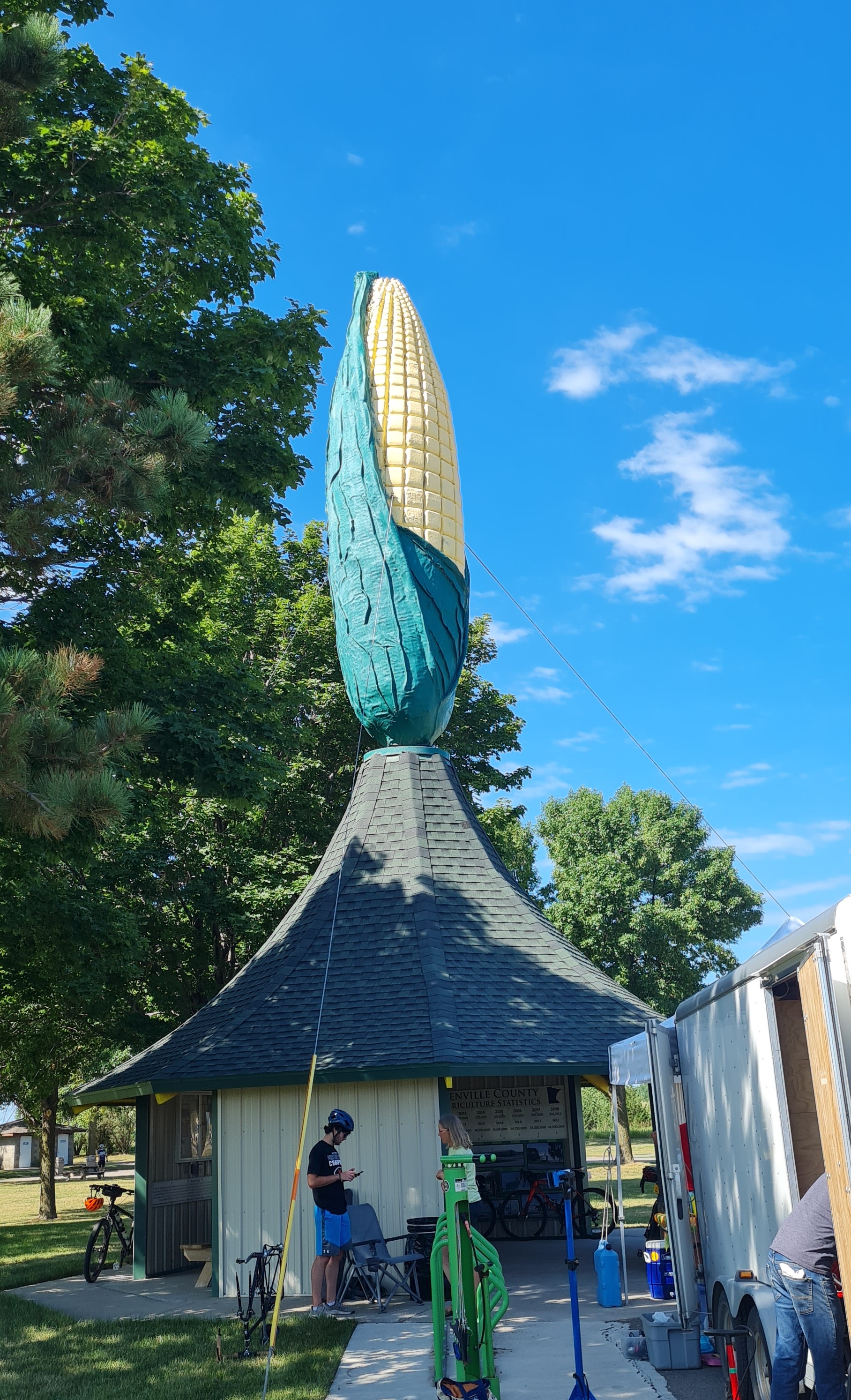 Sans surprise, notre picnic nous a menés à Olivia, capitale du maïs !! Le journal du coin nous y attendait. Ils avaient entendu parler d’un groupe de cyclistes fous qui étaient passés la veille à Madison et ils sont venus nous rencontrer et nous demandons d’où nous venions, trop contents de voir des étrangers traverser leur belle région. Samedi nous serons dans le journal local.